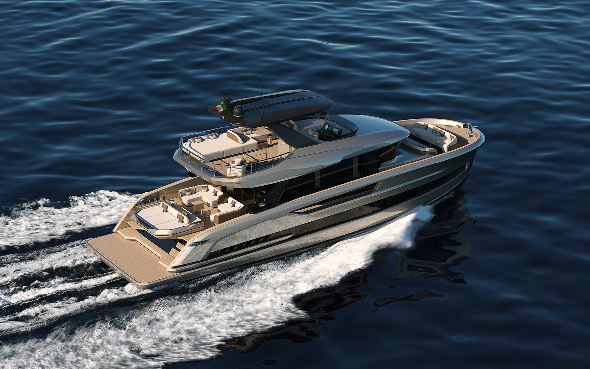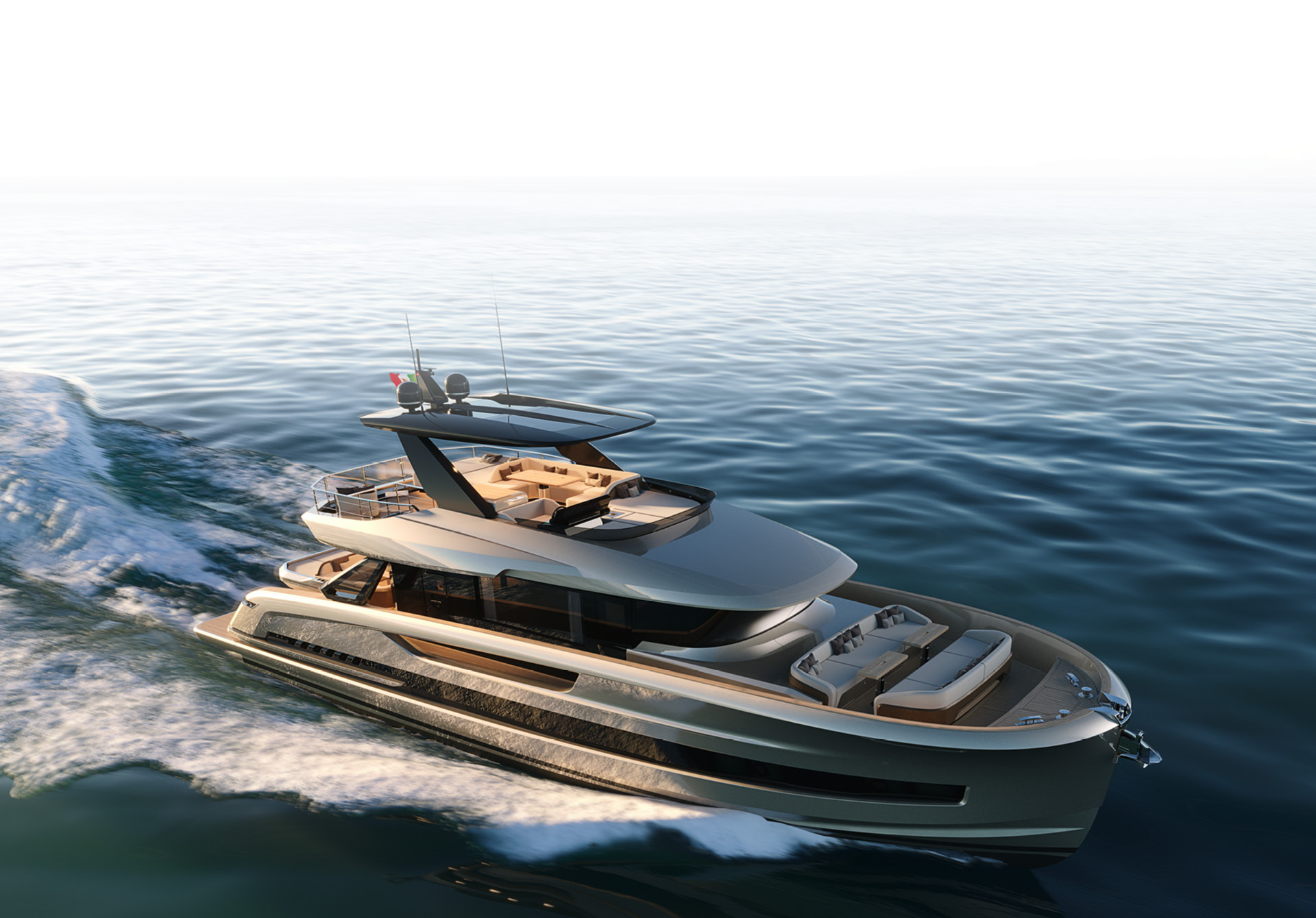 Unlike ordinary boats with planing hulls, Solaris Power are capable to cruise steadily and without roll even in displacement mode.