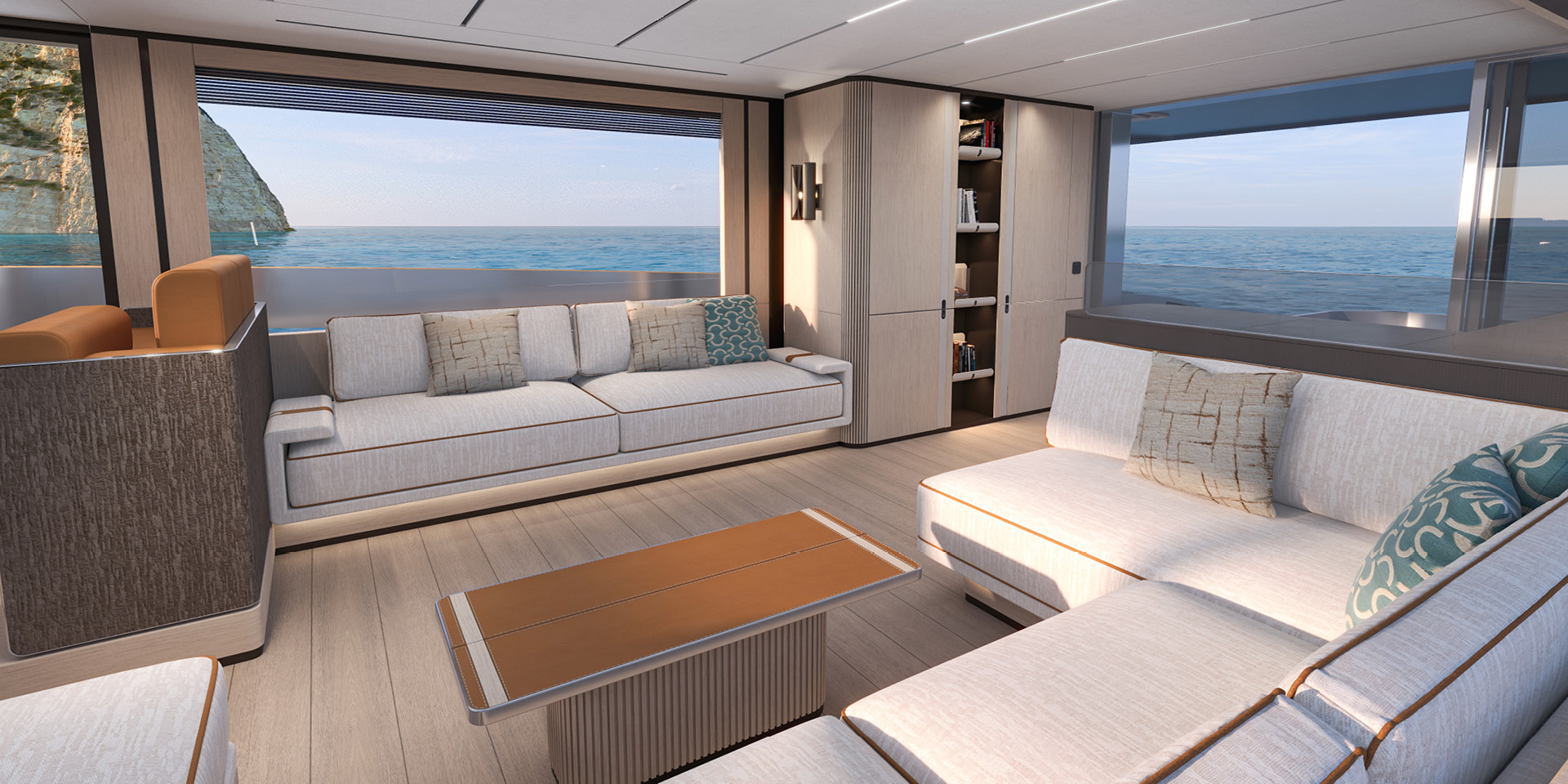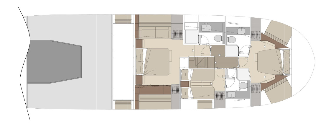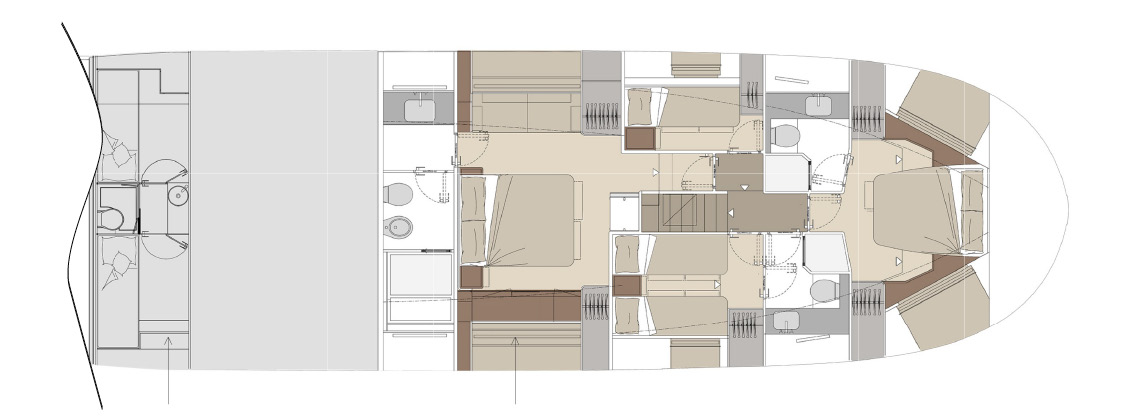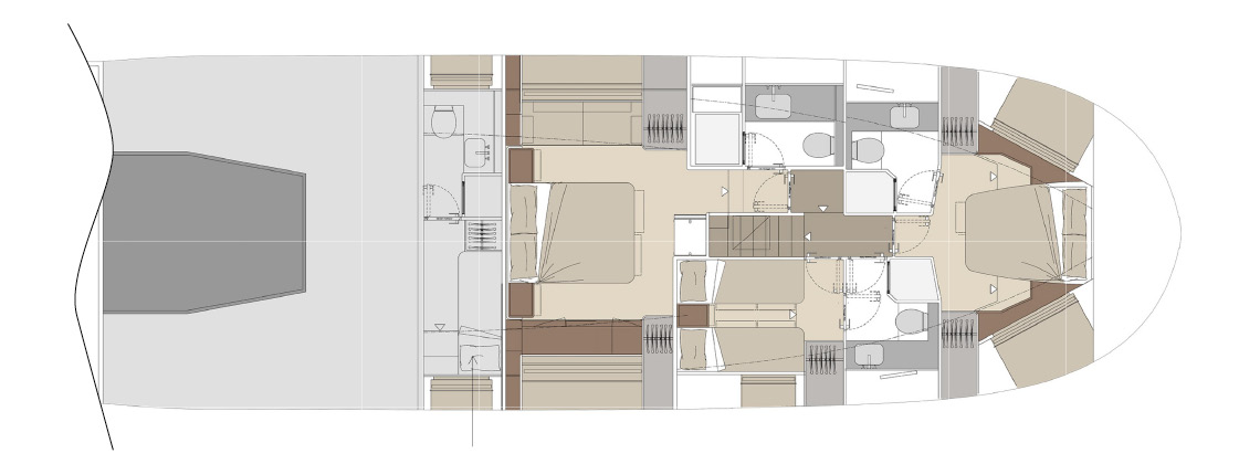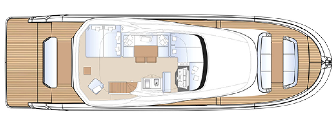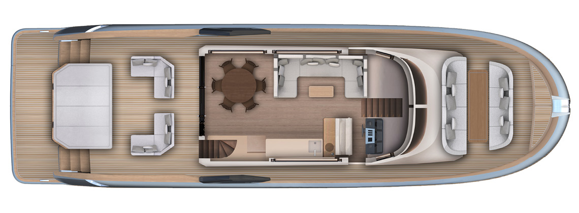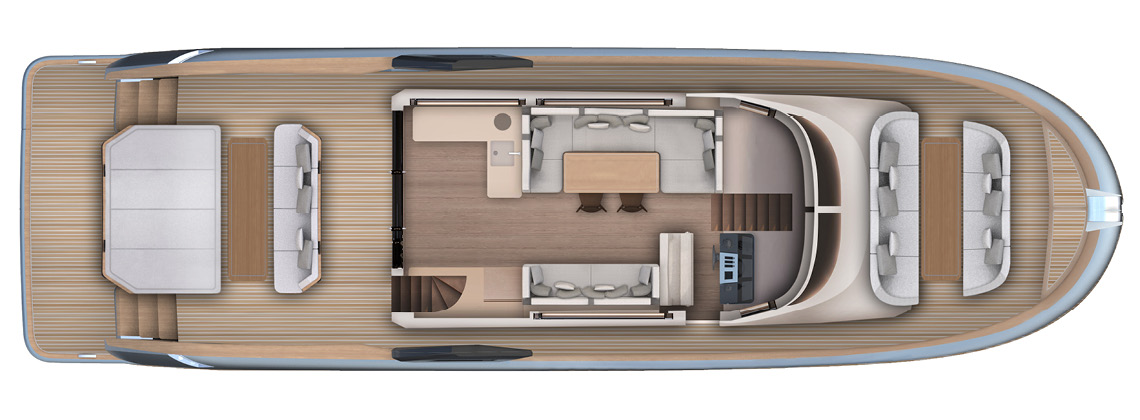 An ideal proportion between internal and external spaces allows guests to move around freely, enjoying every moment of life on board. Contact with the sea is continuous, and protection from the sun is guaranteed by large shaded areas. Life in the cockpit couldn’t be more comfortable.