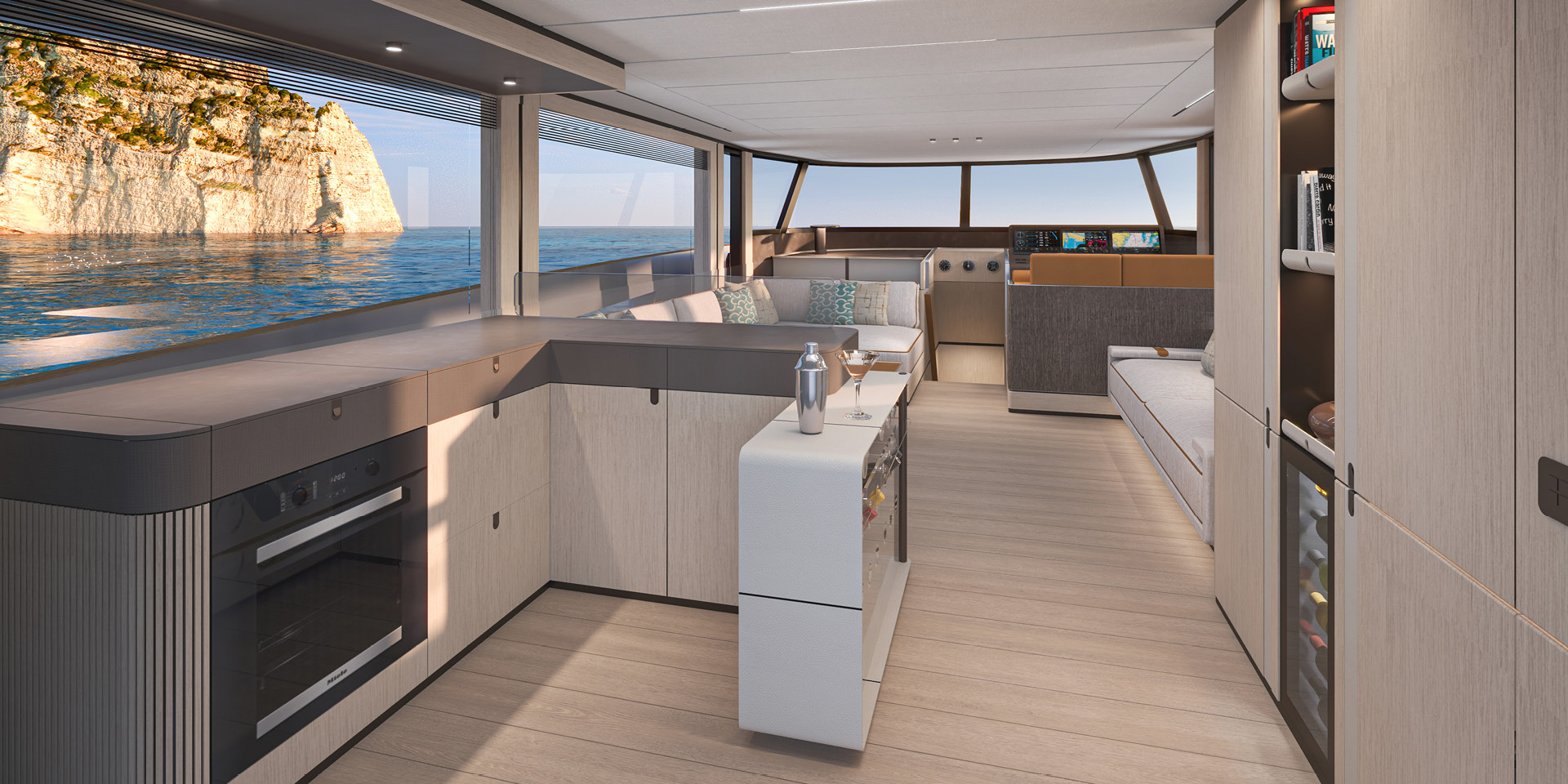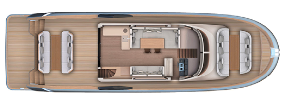 Designed as a true open-air living area, the flybridge offers generous space to relax, dine and enjoy life on board. A large sofa and comfortable sunbeds invite guests to unwind while taking in the surrounding views, while the dining table creates the perfect setting for convivial meals outdoors. Completing the space, a compact yet fully equipped galley allows drinks and light dishes to be prepared with ease.