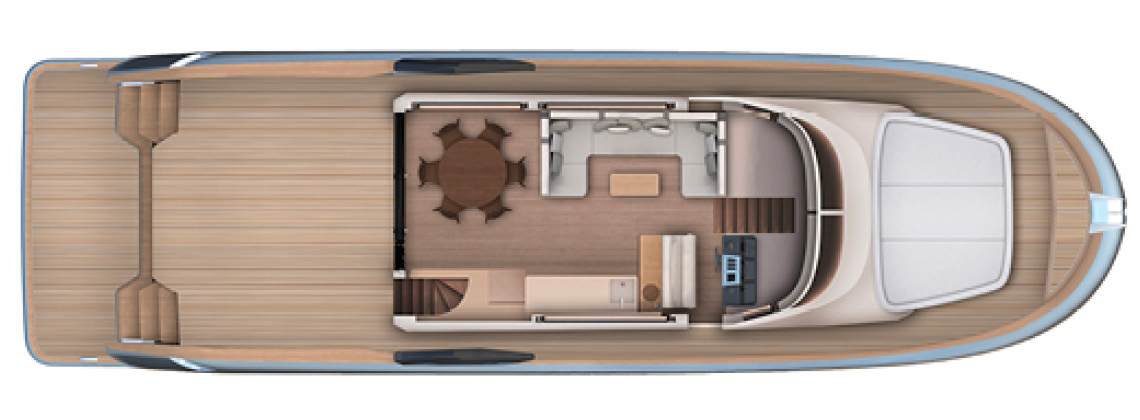 Progettato come un vero spazio living all’aperto, il flybridge offre ampi spazi per rilassarsi, pranzare e godersi la vita a bordo. Un grande divano e comodi prendisole invitano gli ospiti a distendersi ammirando il panorama circostante, mentre il tavolo da pranzo crea l’ambiente ideale per piacevoli momenti conviviali all’aperto. Completano lo spazio, una cucina compatta ed attrezzata che consente di preparare con facilità drink e piatti leggeri.